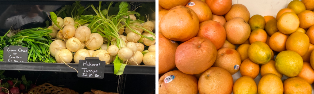 - مقامی طور پر اگائے جانے والے پھل اور سبزیاں – آڑو، خربوزہ، چیری، گرمیوں میں تازہ مکئی، سیب، ناشپاتی، یا سردیوں میں اسکواش،